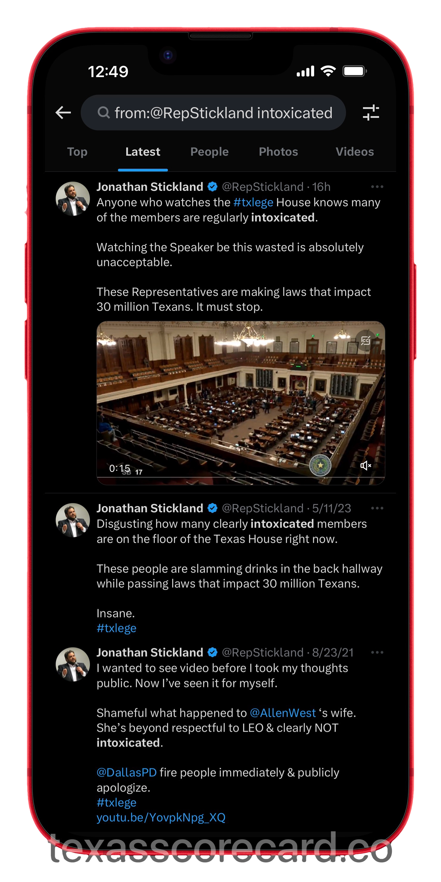 Jonathan Stickland's latest tweets accusing members of the Texas Legislature of being drunk