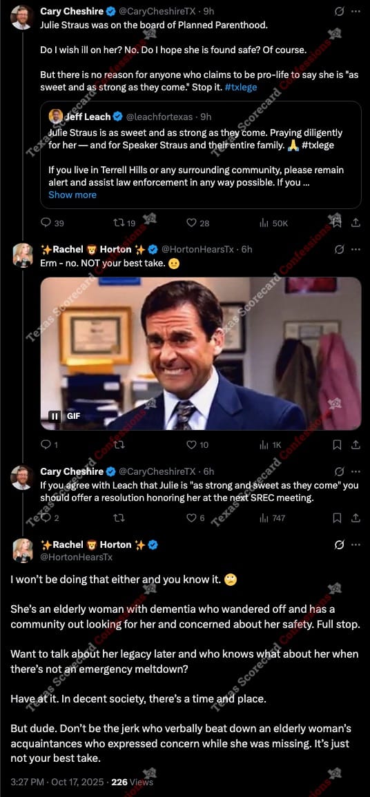 To understand why Cheshire attacked expressions of concern for Julie Straus, you need to understand the context: her husband is Joe Straus, who served as Speaker of the Texas House from 2009 to 2019.