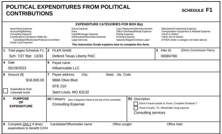 Was Defend Texas Liberty PAC's payment to Influenceable Legal?