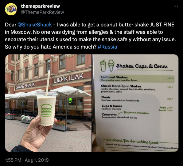 Based on media coverage of the location's opening and a post on Twitter by an unidentified individual, Scorecard Confessions has corroborated the presence of this Shake Shack location in Moscow. The external appearance of the store has been confirmed through the provided evidence.