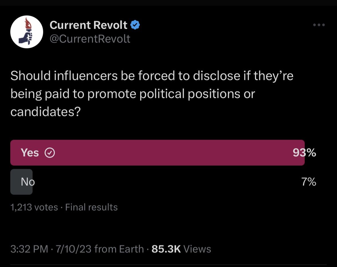 The website Current Revolt conducted a poll on Twitter, with an overwhelming majority voting in favor of requiring disclosure for bought and paid-for tweets in the interest of transparency.