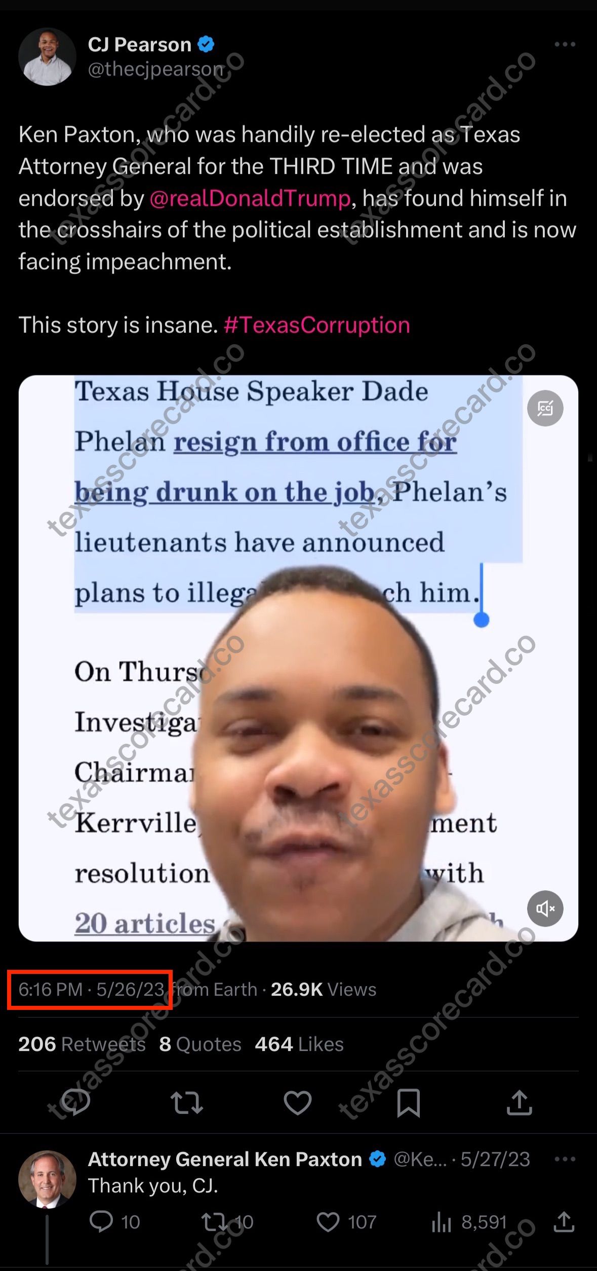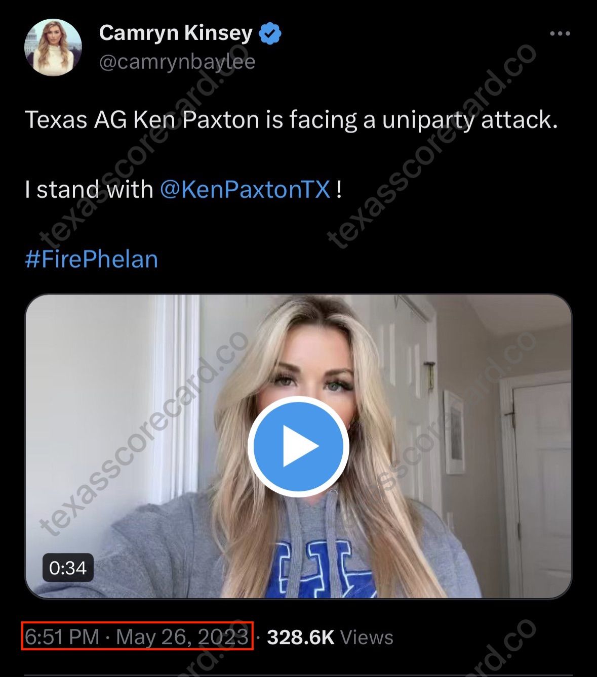 The striking uniformity of supportive tweets, accompanied by videos in which individuals passionately denounce the impeachment of Ken Paxton, begs a few questions: What are the odds that such posts would emerge organically, without any external influence? Could it be a remarkable coincidence that people from different corners of the country express eerily similar sentiments mere minutes from one another using an identical template?