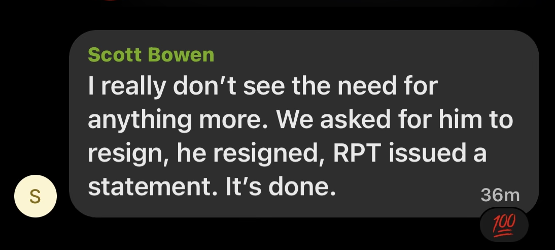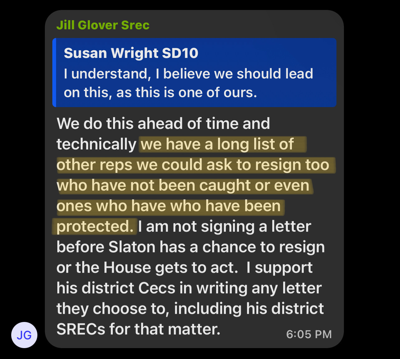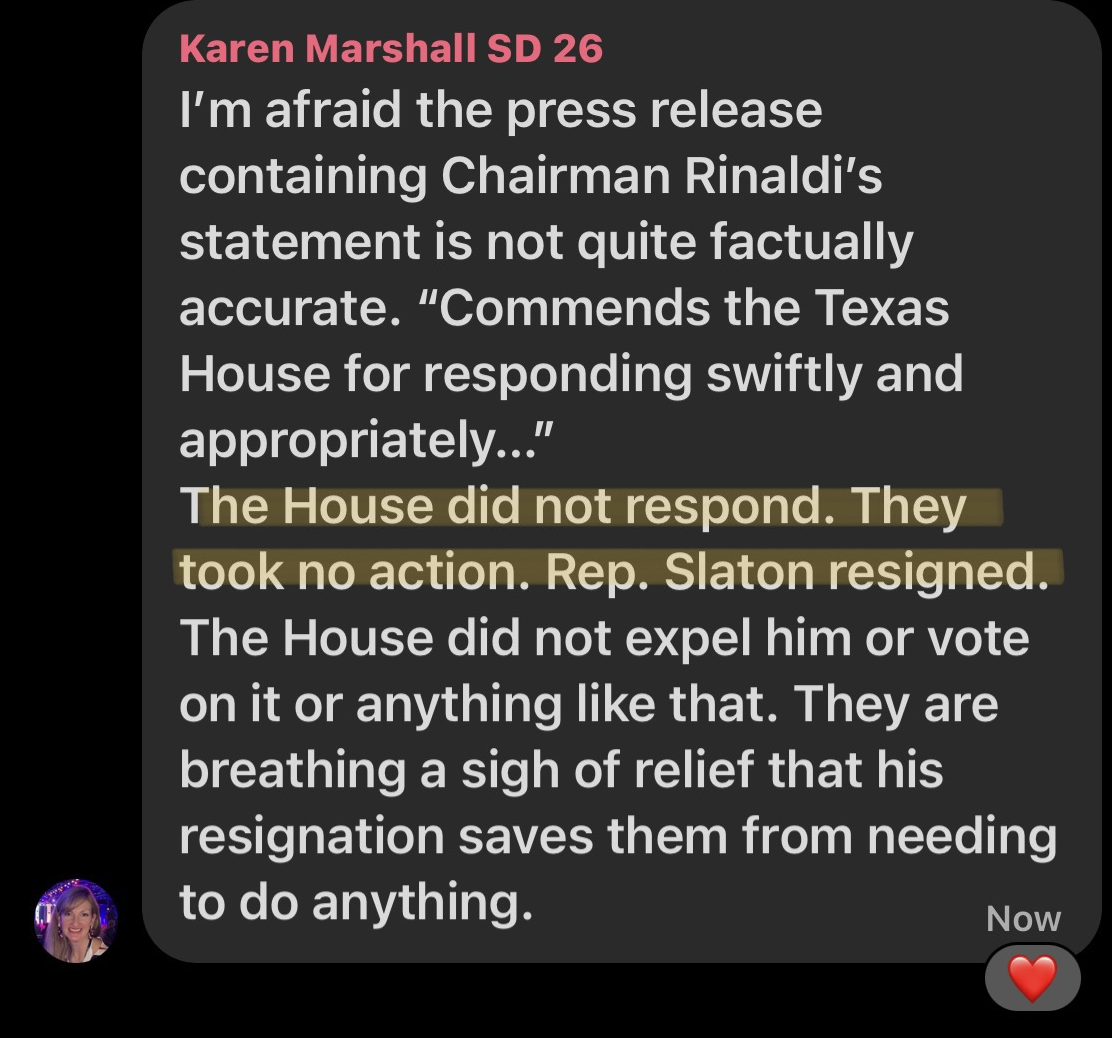 Similar to Glover's statement, the RPT's response also reveals their strategic intent to seek retribution following Representative Slaton's resignation. (emphasis added)