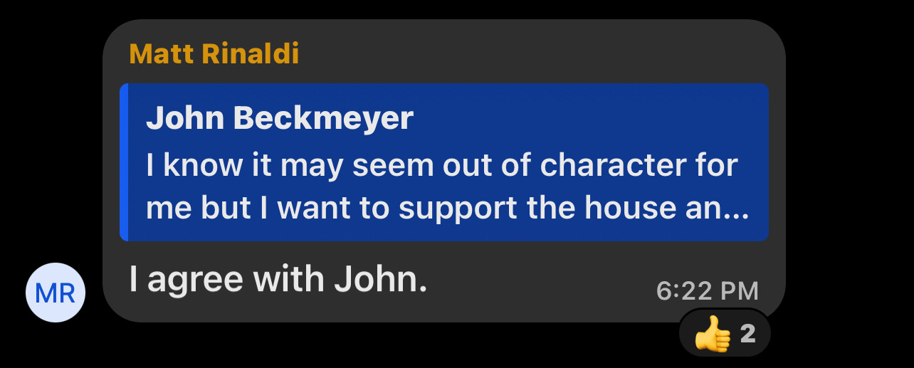 On May 7, as Rinaldi's loyal followers tirelessly defended not speaking against Representative Slaton, the conservative House Freedom Caucus broke their silence and released an official statement: