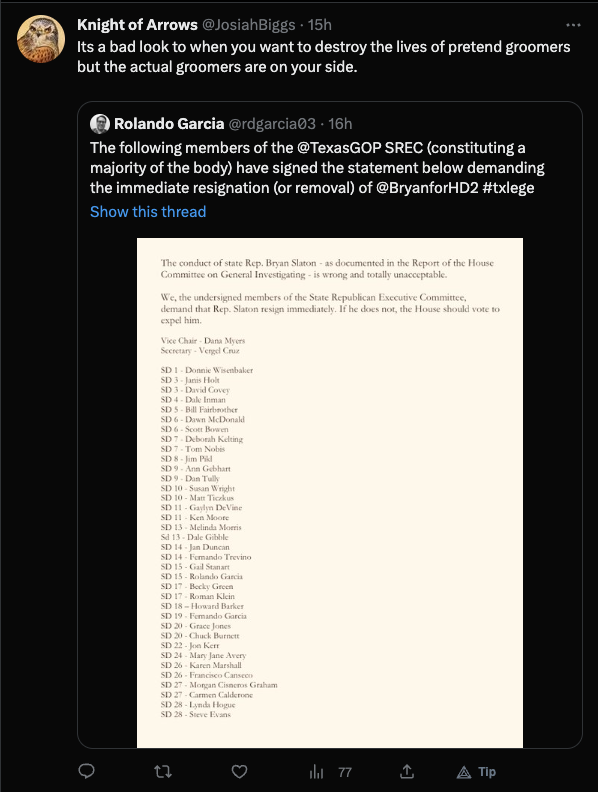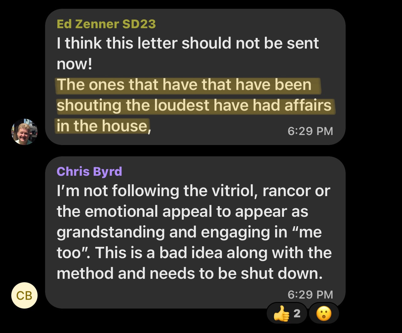 - Sept 3: Demand an investigation and/or expulsion of those members, by conflating their actions to Representative Slaton having sex with a teenager.