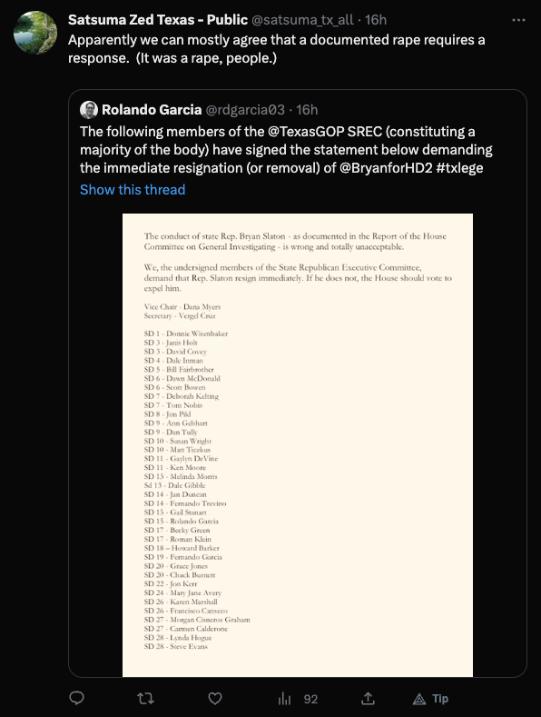 The Texas House Investigative Committee released their findings on Representative Slaton Friday, and the results clearly describe reprehensible, predatory acts towards his young female staffer. Appropriately, the House recommends expulsion, and I am in wholehearted agreement. It would be in everyone's best interest for Mr. Slaton to resign, saving taxpayer time and avoiding further public humiliation. The House Committee has done a difficult job well, and I appreciate their serious deliberation.