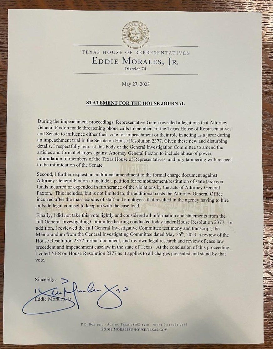 In response to Paxton's actions, Representative Eddie Morales took the initiative to amend the impeachment resolution, including charges of jury tampering and intimidation targeting both House and Senate members.